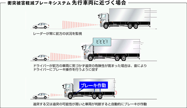 警報やブレーキ作動で注意し危険が高まるとフル稼働し衝突回避、被害軽減のサポートを行います。