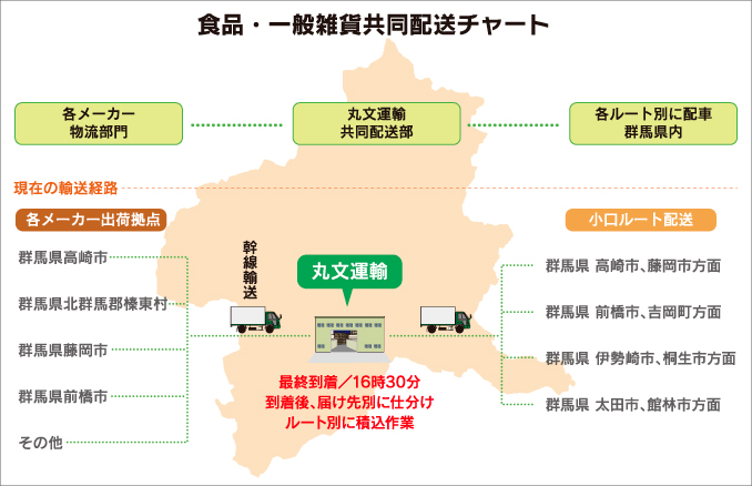 丸文運輸は、食品を含む総合物流を行っております。様々な商品を安全に輸送するノウハウを持っておりますが、丸文運輸の特徴である「共同配送」を行う上で、食品のような軽貨物を混載することが多く、必然的に現在の企業体質が形成されました。